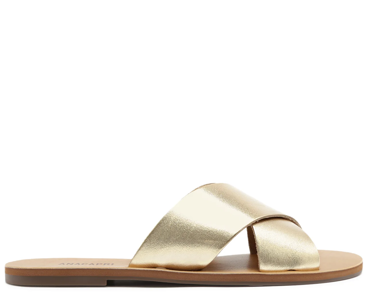 Rasteira Tiras Cruzadas Dourada. Rasteirinha de couro Dourada com duas tiras grossas na gáspea que se cruzam entre si. Palmilha nude com o nome da marca. Deixa dedos e calcanhar à mostra. Nesse modelo aconselhamos a compra de um tamanho maior do que sua numeração convencional.