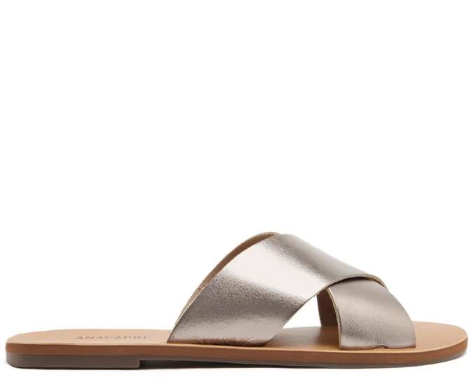 Rasteira Tiras Cruzadas Prata Velha. Rasteirinha de couro Prata com duas tiras grossas na gáspea que se cruzam entre si. Palmilha nude com o nome da marca. Deixa dedos e calcanhar à mostra. Nesse modelo aconselhamos a compra de um tamanho maior do que sua numeração convencional.