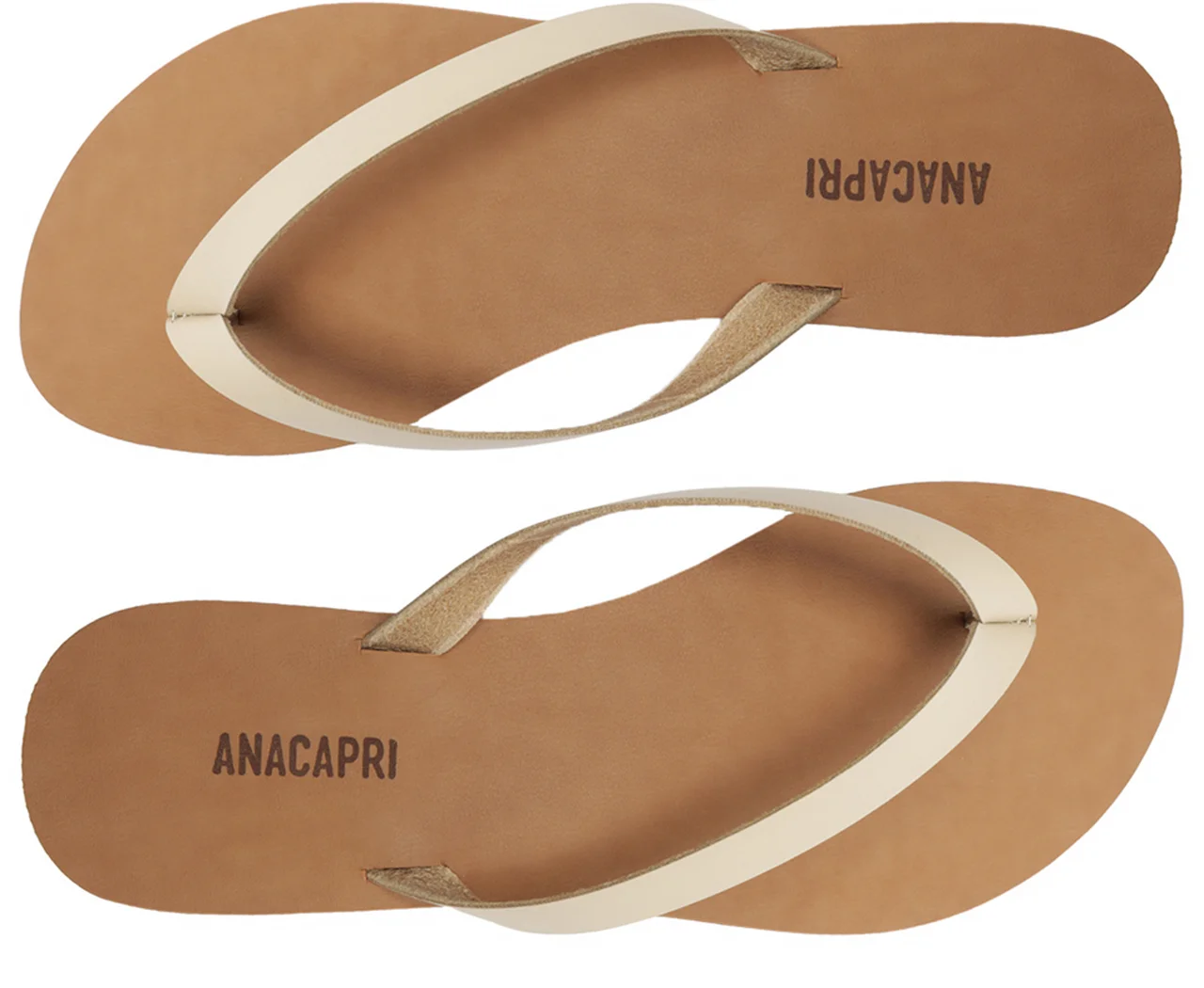 Rasteira slim de couro com tira única, na cor bege. O modelo possui solado rasteiro emborrachado com leve saltinho traseiro e biqueira arredondada. Traz cabedal com tira central em couro que passa entre os dedos e segue pelas laterais. Com palmilha comfy nude e assinatura Anacapri.