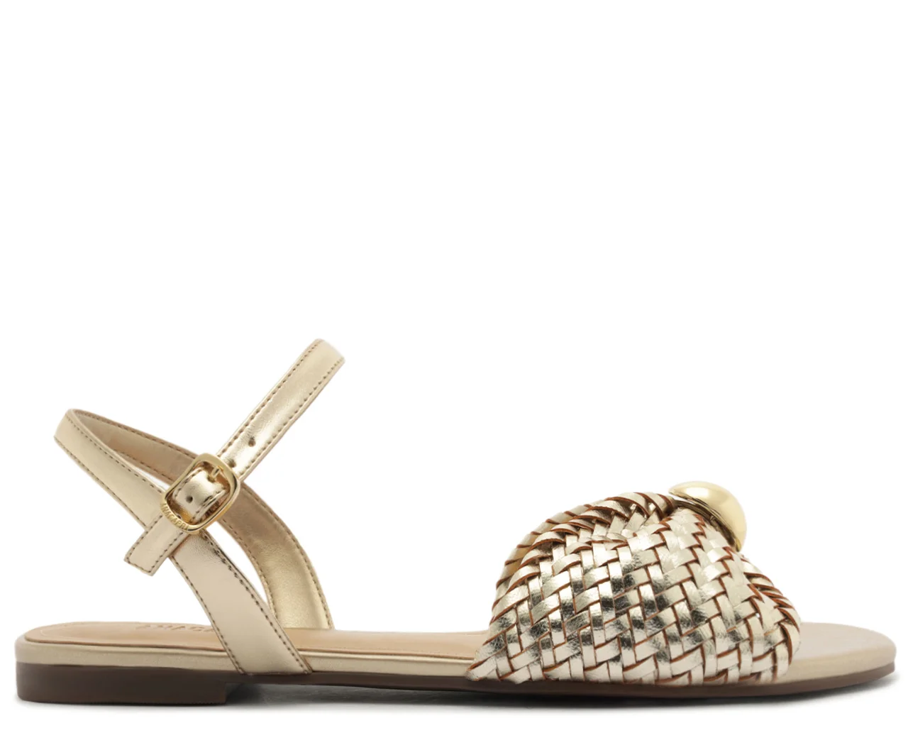 Sandália de tira trançada, com detalhe em adorno metálico, na cor dourada. De material similar ao couro e biqueira arredondada, possui solado emborrachado, com leve saltinho traseiro. O modelo traz cabedal com tira trançada mais larga sobre os dedos, com aplicação de adorno metálico imponente central, arrematando a tira na gáspea. Apresenta tira traseira que contorna o calcanhar, que se conecta na tira superior, com fecho afivelado na lateral do tornozelo. Traz palmilha acolchoada no mesmo tom da sandália, com assinatura Anacapri.