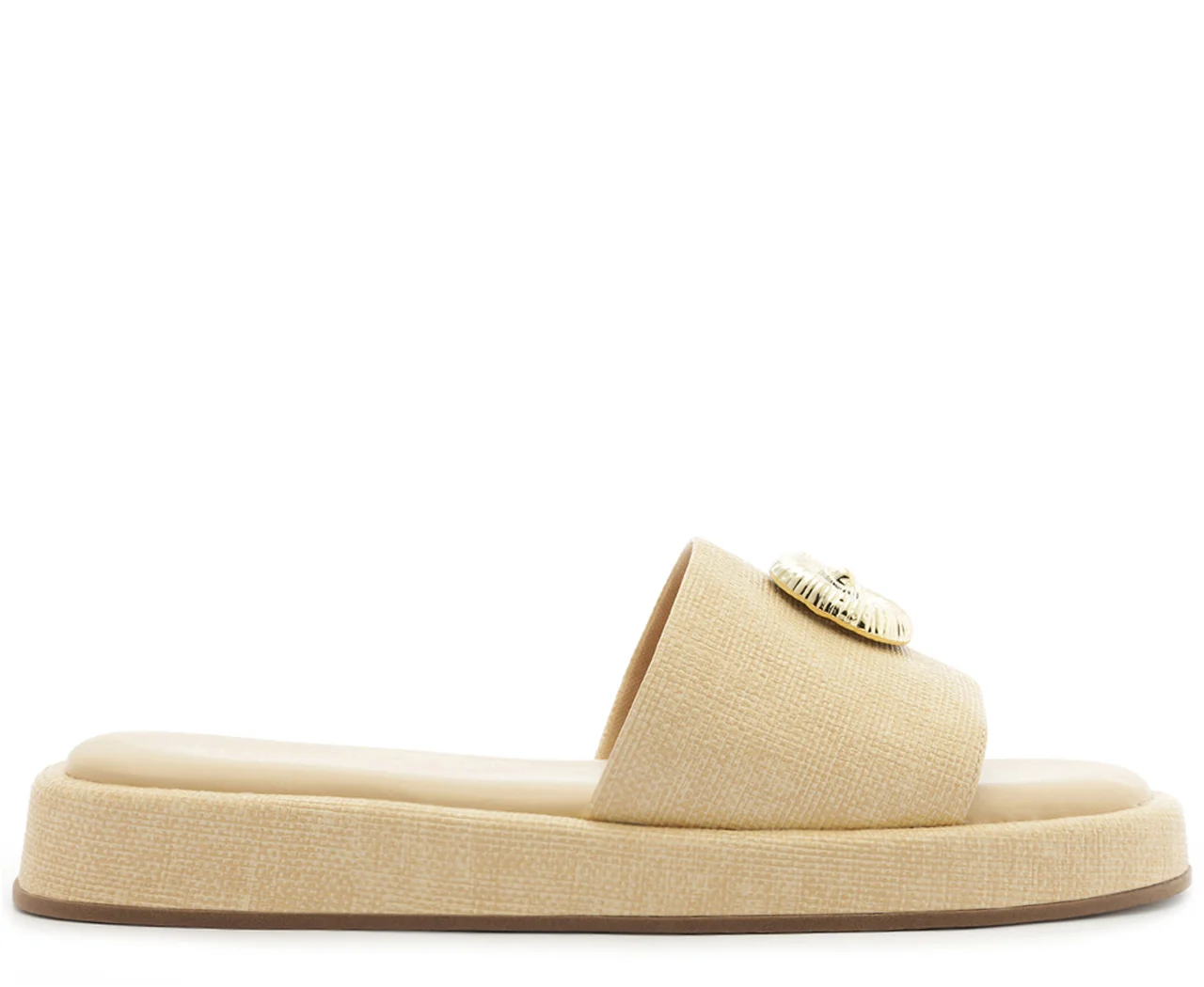 Papete em linho, com detalhe em adornos, na cor bege. O modelo em tecido natural de linho traz biqueira moderna quadrada. De salto flatform baixo, possui cabedal com tira única mais larga sobre os dedos - com aplicação de maxi adornos em shape de concha e estrela do mar. Aberta atrás, a papete possui palmilha acolchoada, com assinatura Anacapri.