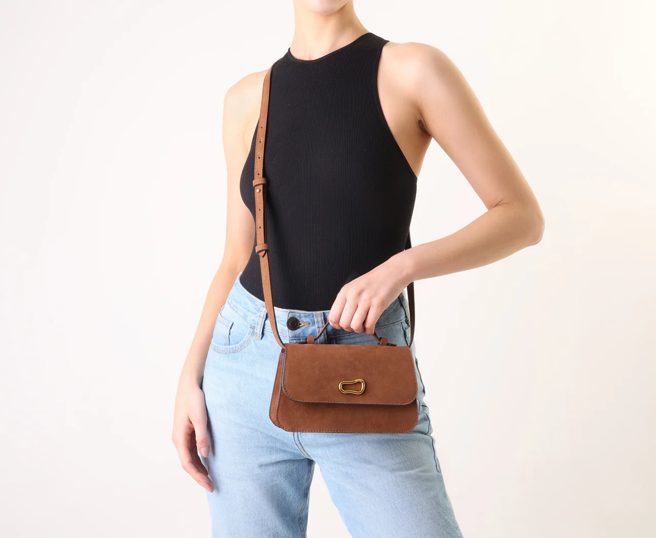Bolsa tiracolo pequena, com adorno em metal, na cor marrom. O modelo em camurça, possui shape retangular e estruturado. No tamanho P, traz alça longa transversal regulável, com alça de ombro fixa, com forro em tom rosê e bolsinho na parte interna. Com detalhe de acabamentos a fio contrastantes por toda a peça, possui fecho no tampo, por botão de ímã.Traz aplicação de adorno metálico imponente - com shape orgânico - centralizado na parte superior do tampo, com detalhe para assinatura discreta e personalizada Anacapri.