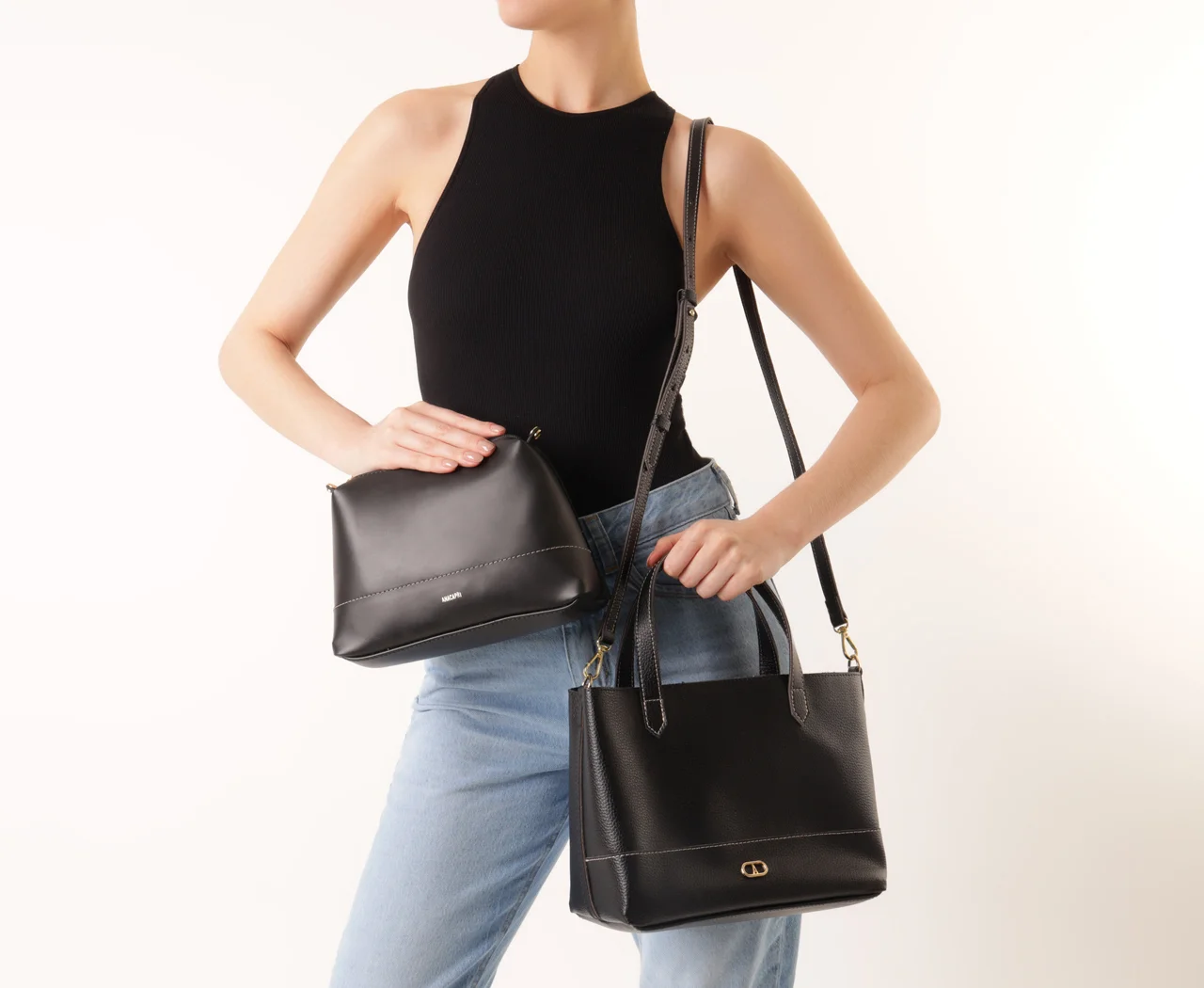 Bolsa tote média com necessaire, na cor preta. O modelo de tamanho M é feito em material similar ao couro, com efeito texturizado soft. Com shape retangular e estruturado, traz duas alças de mão dobradas e uma alça transversal regulável e removível. Possui fecho superior por botão de pressão com ímã. Apresenta detalhe em costura pespontada em toda a borda inferior da peça, com aplicação de cápsula de metal com assinatura Anacapri, centralizada na capa frontal. O modelo acompanha necessaire grande, de mesmo tom da bolsa, com fecho superior em zíper metálico. O acessório pode ser utilizado separadamente da bolsa.