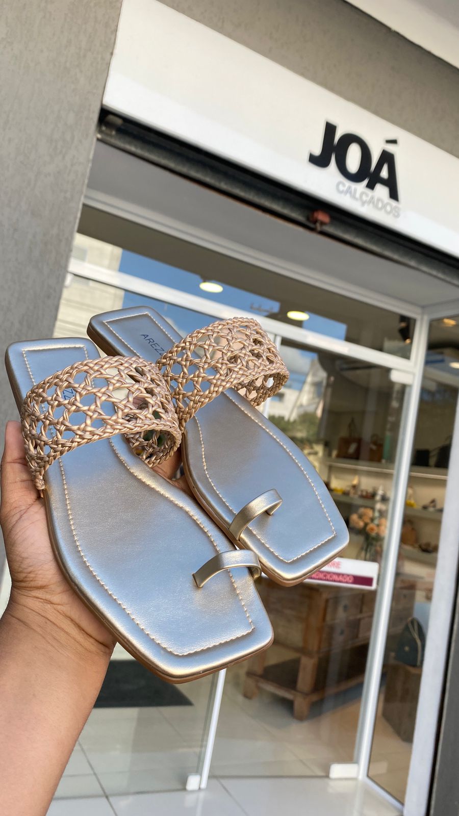 Sandália rasteira feminina com design moderno e sofisticado. O modelo possui tira larga em detalhe tramado bege, que garante um toque artesanal e elegante, além de palmilha clara com acabamento delicado. O bico quadrado e o detalhe dourado no divisor de dedos deixam a peça ainda mais estilosa, ideal para compor produções casuais e chic no dia a dia ou em ocasiões descontraídas.