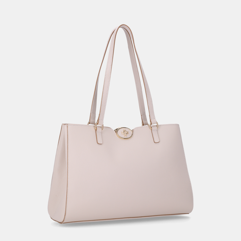 A Bolsa Shopping Luz da Lua 2000751 New Ridge/Panna une sofisticação e funcionalidade em um design clássico e versátil. Confeccionada em couro legítimo, apresenta textura suave e acabamento em tom panna, perfeito para composições elegantes e neutras. Seu formato estruturado e amplo oferece espaço ideal para carregar todos os itens do dia a dia, enquanto as alças duplas garantem conforto no uso. O logo metálico dourado Luz da Lua adiciona um toque refinado e moderno, tornando-a uma escolha perfeita para o trabalho ou momentos casuais com estilo.