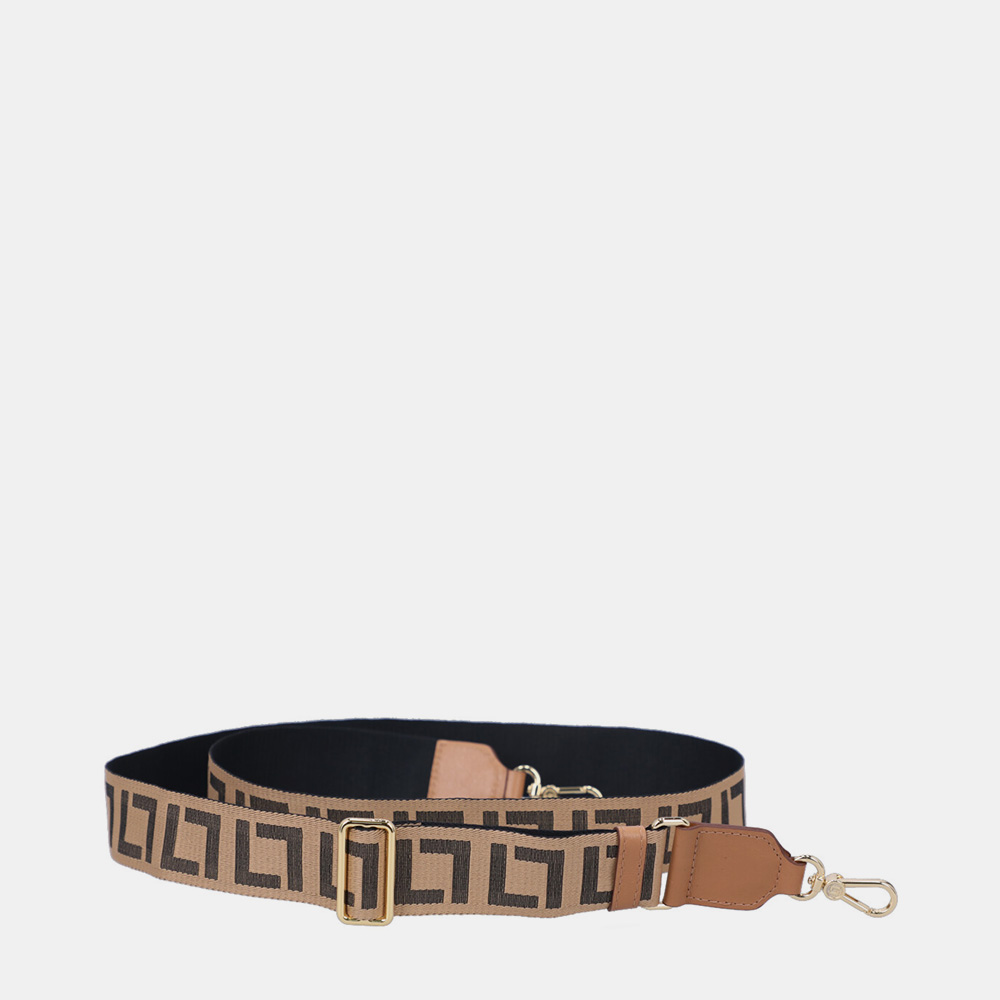 Alça removível e ajustável da marca Luz da Lua, modelo 4500008, confeccionada em material resistente com estampa geométrica sofisticada e detalhes em couro na cor amêndoa. Ideal para personalizar bolsas, oferecendo conforto e um toque de estilo exclusivo. Possui mosquetões metálicos dourados para fácil fixação e ajuste de comprimento.