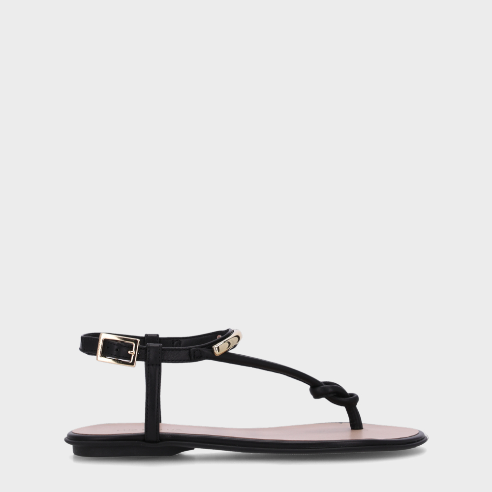 Rasteira em couro, na cor preta. Modelo com tiras em torno do calcanhar, laterais e sobre o peito do pé, além de uma tira fina que divide os dedos e possui efeito nó. Possui solado rasteiro emborrachado, bico redondo e fechamento com fivela de metal dourado. Detalhe para a peça dourada sobre o peito do pé.