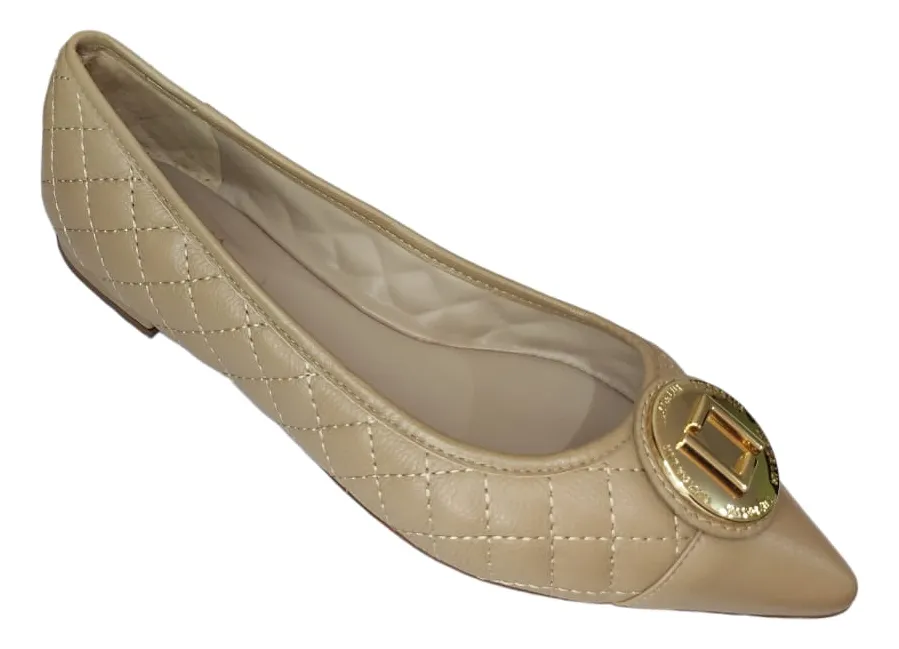 Sapatilha sandalo nude, confeccionado em couro matelassê, solado emborrachado, salto com 1 cm de altura, fivela de enfeite dourada escrito luz da lua em volta com logo no meio.
