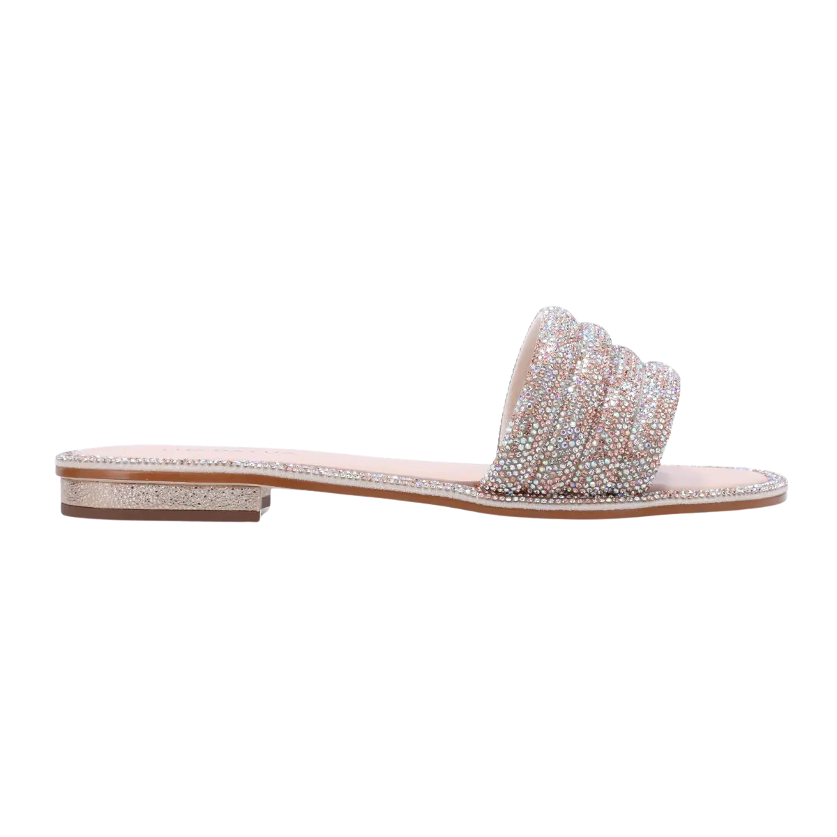 Sandália rasteira feminina com design elegante e moderno. Possui cabedal em tecido sofisticado com brilho discreto, que adiciona um toque de glamour ao visual. Modelo flat, confortável e prático para o dia a dia, ideal para compor produções casuais ou mais refinadas.