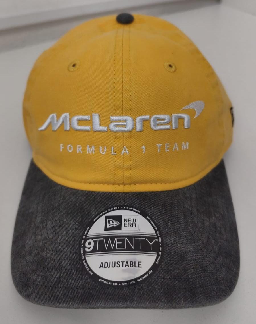 Boné New Era 9FORTY McLaren Fórmula 1 Team, modelo ajustável com aba curva. Com design moderno, apresenta painel frontal em amarelo vibrante com o logo McLaren bordado em branco e aba em tom grafite, unindo autenticidade, estilo esportivo e conforto para os fãs da escuderia e do automobilismo.