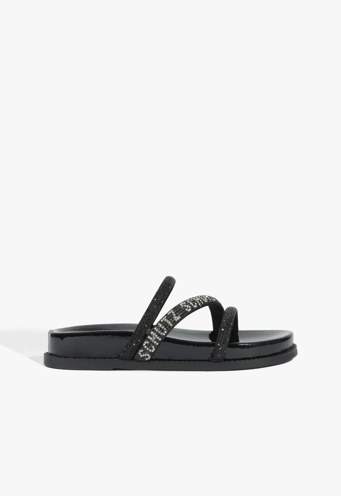 A papete Schutz S215640474 traz o equilíbrio perfeito entre conforto e sofisticação. Com tiras finas em acabamento preto e aplicação de cristais, esse modelo flat adiciona brilho e personalidade ao visual. A palmilha anatômica e a sola levemente elevada garantem bem-estar ao caminhar, sendo uma excelente escolha para o dia a dia com um toque de glamour. Versátil, combina com produções leves e descontraídas, como vestidos, jeans ou conjuntos de alfaiataria casual.