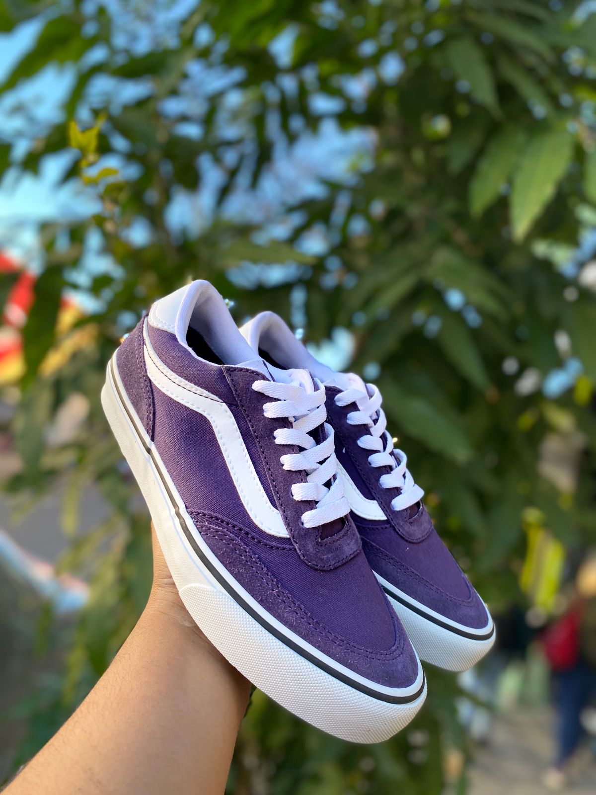 O tênis Vans Old Skool roxo com a icônica faixa lateral branca é confeccionado em camurça e lona de alta qualidade. Possui solado de borracha vulcanizada para maior aderência e durabilidade, além de palmilha confortável que garante uso prolongado. Seu design vibrante e estiloso é ideal para compor looks casuais e modernos.